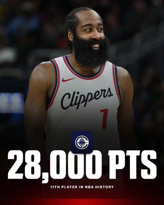 哈登28000分里程碑:现役第3仅输詹杜+历史第11 神迹历史第一